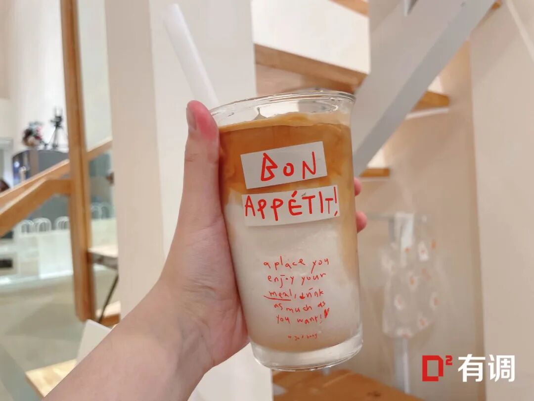 杯身法语的意思是【祝你用餐愉快】,装上简单的冰咖啡,外杯壁洇上一层水雾,在依然炎热的天气里带给你一丝清凉~