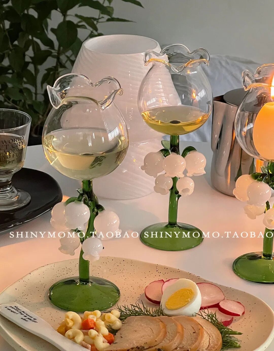 Shinymomo家的红酒杯都很貌美,眼花缭乱到让人忍不住想要剁手买买买~就像这款铃兰红酒杯,真的是从头美到脚,杯口呈花朵状,杯脚上长出了几朵晶莹透亮的铃兰花,摆在桌子上就美爆了!