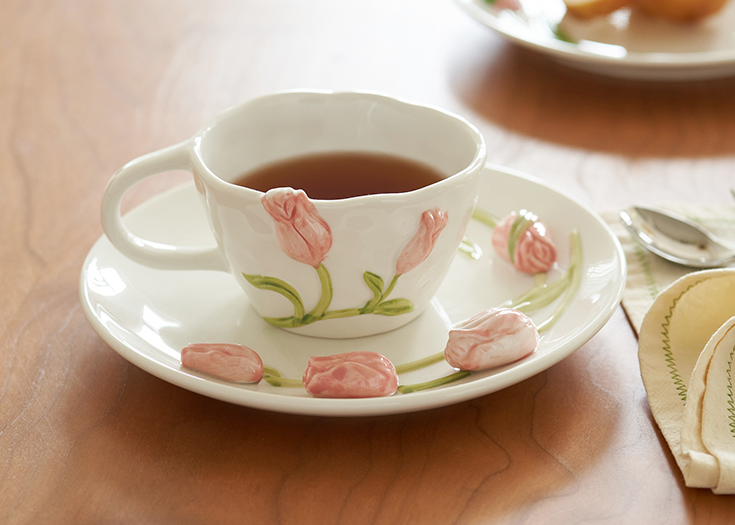 立体的粉色郁金香缱绻绽放在杯碟之上,就像是新摘的花骨朵儿不小心遗落在这里。这套杯子用来待客绝对是人见人夸的大杀器,放在那里就自成一道美丽的风景线,让饮茶都美得不可方物~