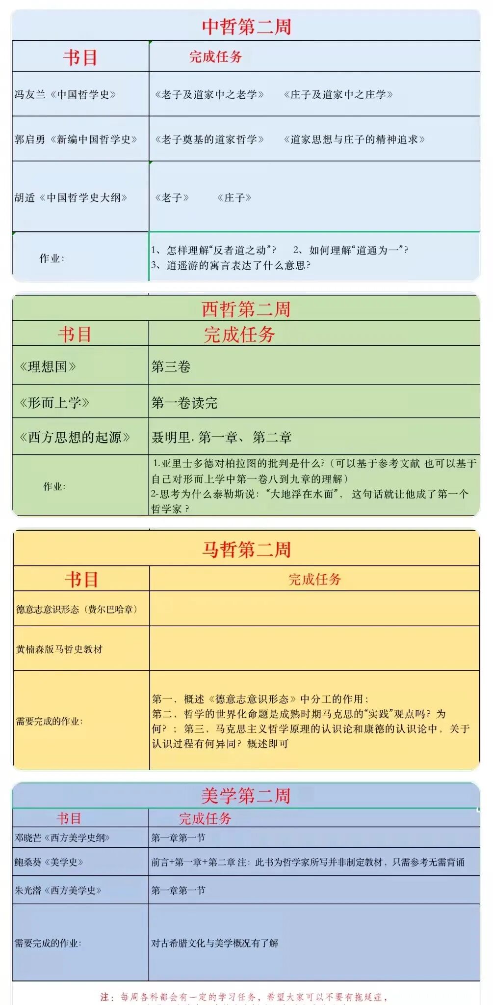 大家可以根据自己的兴趣爱好以及哲学喵先导班阅读任务的学习情况逐步确定好自己要报考的专业。再结合自身情况选出最适合自己、考研难度有区分度的两个学校(注意:学校的考试科目、参考书目不要差太远)。