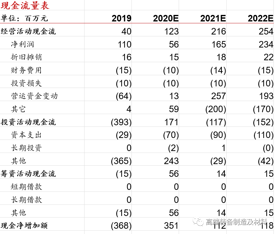 根据以上假设,我们预计中山金马2020~2022年营业收入分别为5.6亿元、8.5亿元和11.5亿元,增速分别为-11.2%、53.7%和35.2%,净利润分别为0.56亿元、1.65亿元和2.34亿元,增速分别为-48.9%、194.0%和42.4%,EPS分别为0.5元/股、1.6元/股和2.3元/股。