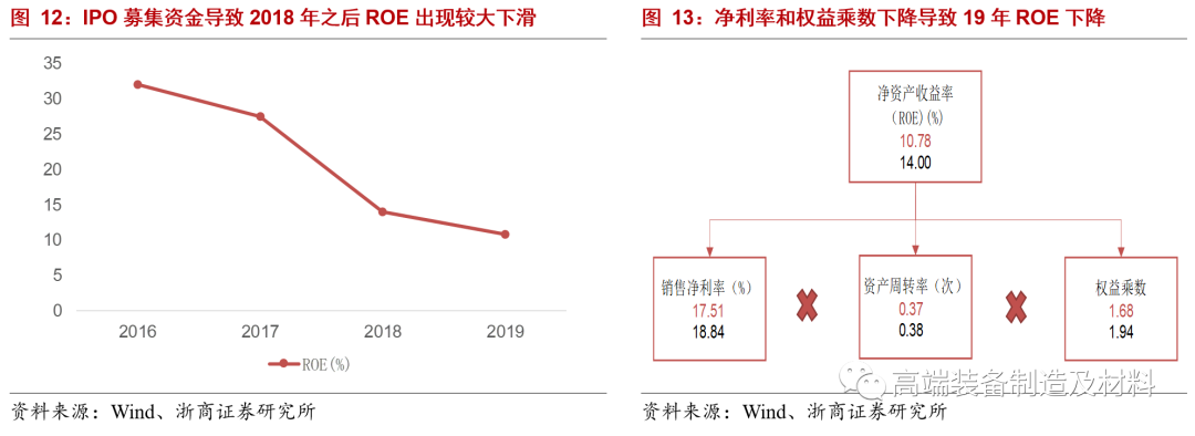2019年ROE为10.78%,相比2018年有一定幅度的下滑。19年ROE下降主要是受到净利率和权益乘数下滑影响。净利率方面因为当年研发费用的大幅增加,导致有小幅的下滑。权益乘数下滑主要是因为公司应付账款、应付职工薪酬和预收款项减少所致。整体来看,公司历史ROE一直处于相当优异的水平,2016-2019年的几何ROE为19.1%。2018年以后ROE有所下滑,主要是因为IPO募集资金导致的资产周转率和权益乘数有较大幅度的回落。