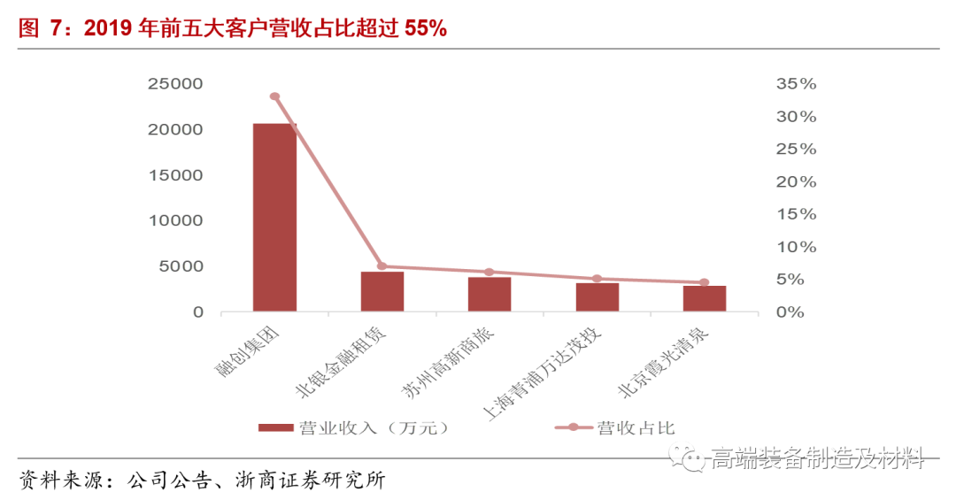 前五大客户收入历年来占比较高,销售对象较为集中。2019年,公司前五大客户营收合计3.5亿人民币,占整体营收比重达到55.7%,其中最大客户为融创集团,实现营收2.1亿元,占比33%。销售对象涵盖其旗下多家子公司:包括无锡融创城投资有限公司,重庆万达城投资有限公司和广州万达文化旅游城投资有限公司等。