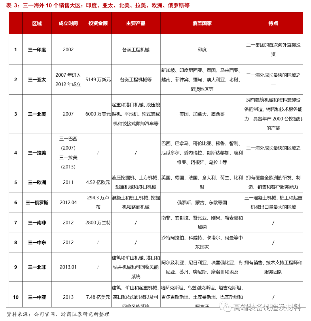 根据三一2019年年报,三一在印尼区域、三一美国、三一欧洲、俄罗斯区域、拉美区域销售额均实现快速增长。