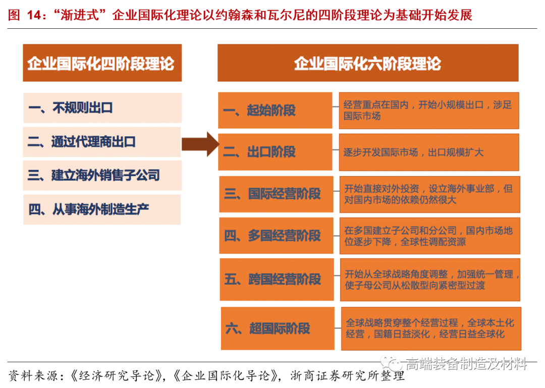 20世纪70年代中期,瑞典经济学家约翰森和瓦尔尼提出了企业国际化四阶段理论,美国经济学家罗伯逊在此基础上提出了六阶段理论。这些理论都表明企业国际化是一个循序渐进的过程,综合起来称为“渐进式”国际化理论。