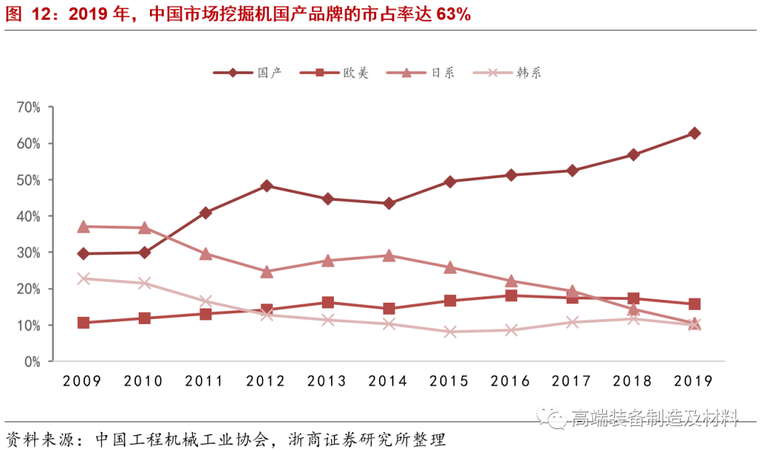 在中国市场,国产品牌市占率从2009年的30%,提升至2019年的63%。2019年,三一重工挖掘机中国市场市占率达26%,稳居首位。