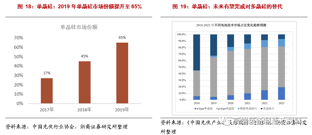 单晶硅:受益“行业增长+占比提升+大尺寸迭代”三重因素;2019年单晶硅市场份额提升至65%。根据中国光伏行业协会《中国光伏产业发展路线图(2019)》,2019年国内单晶硅片实际市场份额约为65%,预计2020年市场份额突破75%,并逐步于2023年增至80%,逐步完成对多晶硅片的替代。