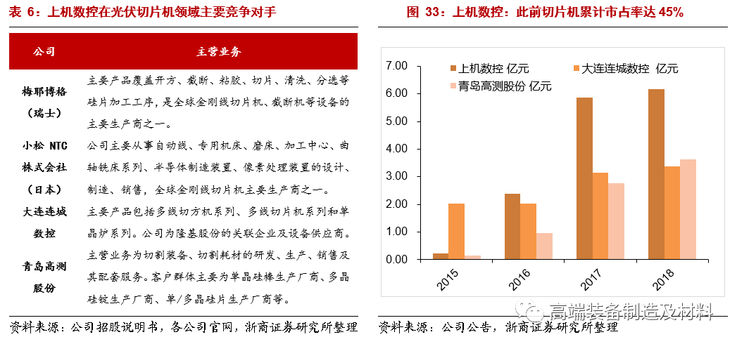 目前中国市场上光伏金刚线切片机主要为上机、大连连城(隆基股份关联方企业)、青岛高测(原新三板公司,拟科创板上市)3家寡头竞争。2015-2018年上机切片机累计销售额近15亿元,约占国产切片设备市场45%。