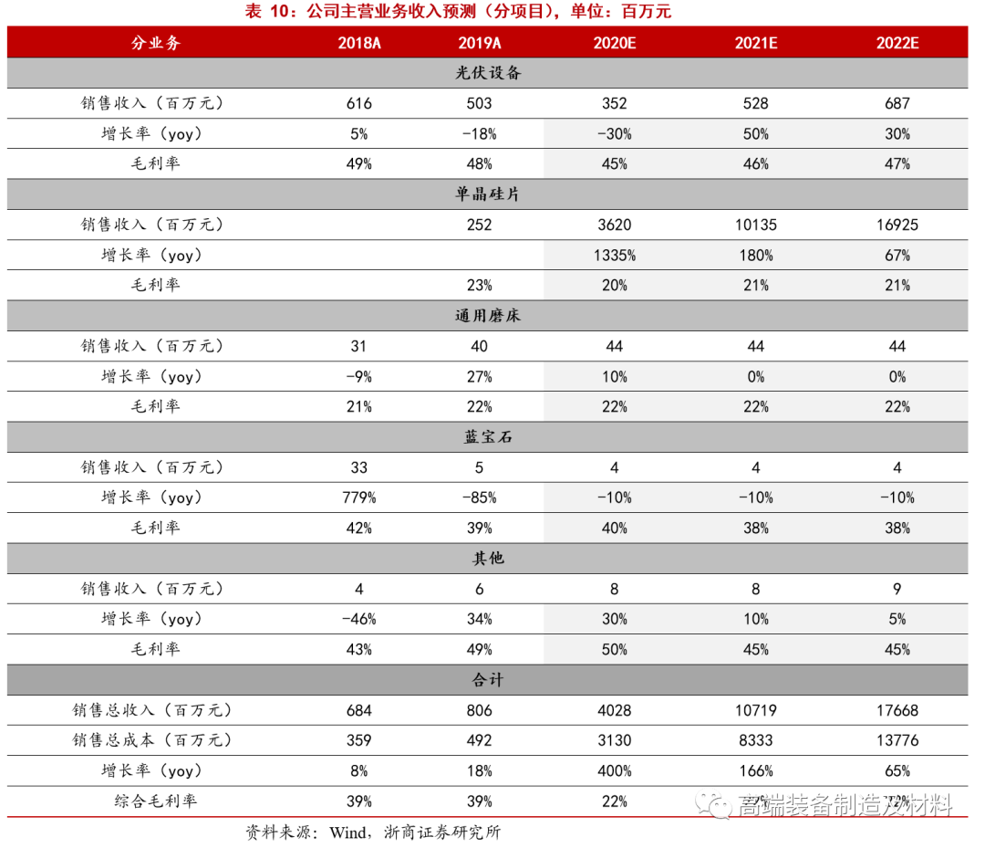 预计2020-2022年单晶硅业务收入分别为36/101/169亿元,同比增长1335%/180%/67%,毛利率20%/21%/21%。