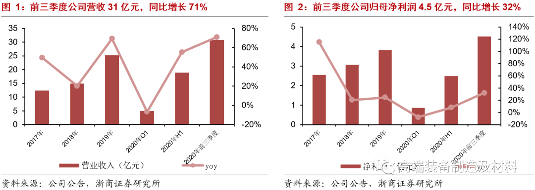 核心观点: 三季报业绩加速增长,营收yoy+71%,归母净利润 yoy+32% 2020年下半年以来,随着光伏电池片扩产需求的高景气度回升,以及疫情过后公司订单确认周期的缩短,公司业绩保持加速增长态势。1)公司前三季度实现收入30.8亿元,同比增长71%;归母净利润4.5亿元,同比增长32%;扣非净利润4.1亿元,同比增长28%。2)其中,单Q3季度收入11.9亿元,同比增长103%;归母净利润2亿元,同比增长83%。 盈利能力短期承压,期间费用率管控良好 1)毛利率:前三季度为27%,同比降低6.6pct。其中单Q3毛利率达26%,同比减少7.9pct。毛利率下滑主要因行业竞争加剧、叠加执行新收入准则所致(场外安装调试费用由销售费用调整至营业成本)。 2)净利率:前三季度为14.4%,同比下降4.3%。其中单Q3实现净利率16.6%,同比下降2.1pct。主要受毛利率下滑、及资产和信用减值损失影响所致。 3)期间费用费率:前三季度为8.5%,同比下降4.2pct。其中,销售费用率同比减少4.8pct;管理费用率同比下降1.0pct;研发费用率同比下降0.3pct;财务费用同比增长2pct。 在手订单充沛,业绩高增长有望持续;经营性现金流显著增强 1)2020年Q3公司合同负债33 亿元,较上年同期预收账款增长79%。若按照“3331”的付款条件,假设预收款占订单金额的35%,则测算公司在手订单达94亿元,同比去年Q3增长约42亿元,为公司未来业绩增长提供保障。 2)Q3公司经营活动产生的现金流净额5.7亿元,同比增加11.3亿元。其中,单Q3季度经营性现金流达3.7亿元,现金流情况大幅改善。主要受益于公司存货周转天数和应收账款周转天数的大幅降低所致。 “光伏+半导体”多技术路线布局充分,有望充分受益行业技术迭代 1)光伏设备:公司背钝化技术氧化铝镀膜设备研发已形成批量生产销售,PERC+电池工艺技术钝化设备研发已进入工艺验证阶段。2020年H1公司与爱康科技签署2GW HJT框架协议,将在PECVD等设备方面合作研发,增长潜力可期。 2)半导体设备:公司于2019年启动湿法工艺设备的研发,目前已经完成Dryer平台的开发、部分槽体的开发和部分模组的开发,供应链体系逐步完善。同时,公司在光伏行业具备真空工艺技术,具有对半导体气相沉积设备工艺进行进一步研发的技术基础。 盈利预测 预计2020-2022年净利润6.1/8.3/10.5亿元,同比增长59%/37%/26%,EPS为1.9/2.6/3.3元,对应PE为53/39/31倍。维持“买入”评级。 风险提示:光伏设备及半导体设备新产品进度低于预期;光伏行业波动风险。 |