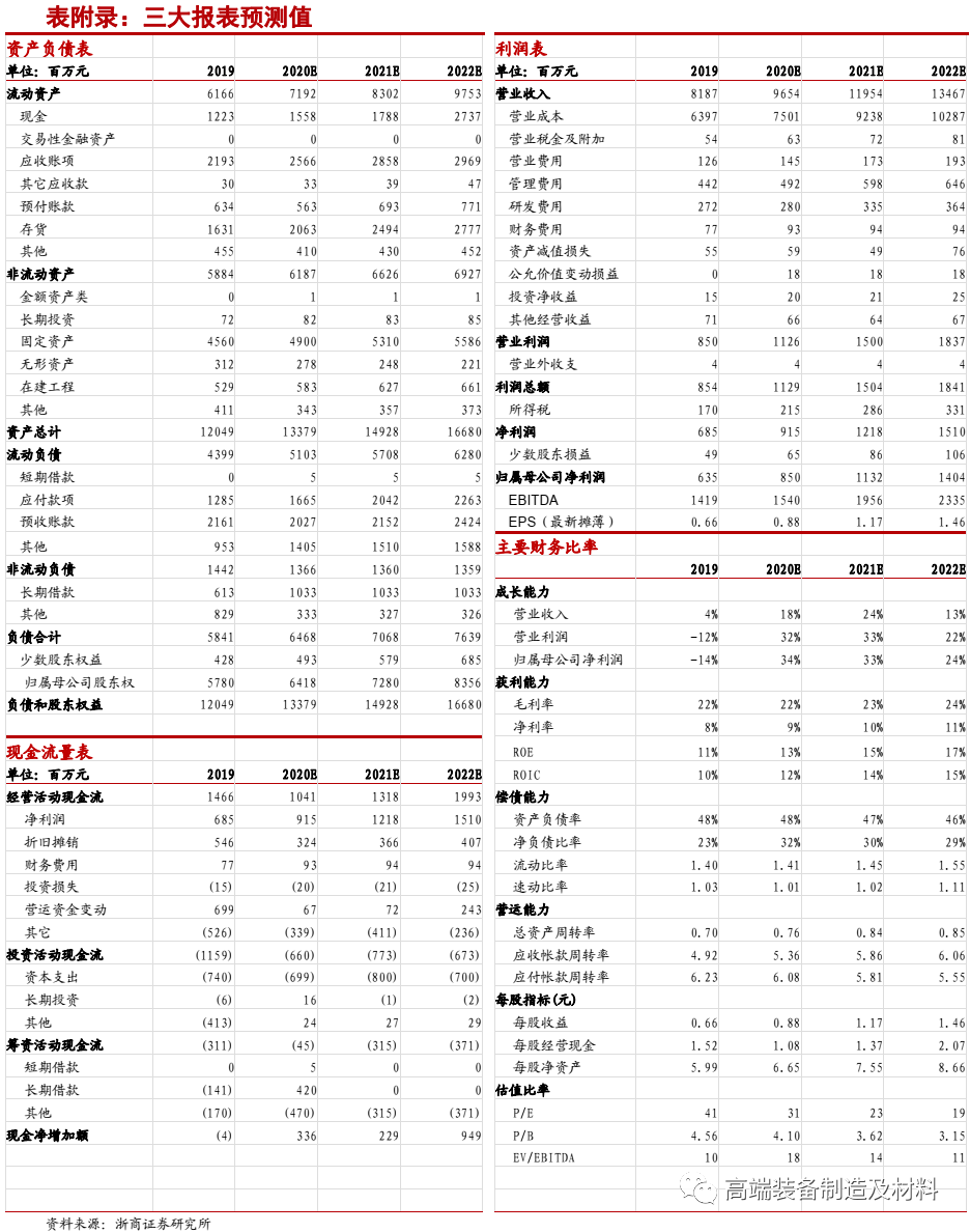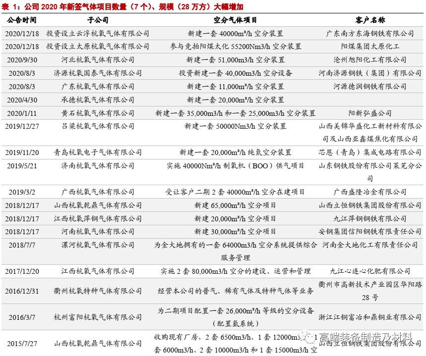 核心观点: 气体项目持续拓展,太原、云浮两项目有望贡献9.5万方新增供气规模 两项目(合计9.5万方)投产后新增供气规模有望占2019年供气总规模的8%。预计公司2020年新签的气体项目有望接近30万方,占2019年供气总规模的24%。1)阳煤集团太原化工新材料有限公司5.52万方空分装置相关资产,若太原杭氧此次竞拍成功,将为阳煤太化提供供气服务。2)公司与广东南方东海钢铁公司签订《供气合同》,投资设立云浮杭氧并新建一套4万方空分装置,项目合同期15年,供气日期为合同签订后的13.5个月,该项目实施有利于进一步拓展和布局华南地区。 在手新签重大供气项目创历史新高,今年新增第三方工业气体市占率第一 近年来公司强化气体业务的意愿增强,作为大型国企、上市公司,在气体项目上竞争优势显著。2019-2020年已公告新签气体项目规模分别为19/28万方,2020年新签规模创下历史新高,预计公司在今年新增第三方工业气体市场中的市占率近50%。预计2021年投产的气体项目规模有望超40万方。预计公司2020-2022年气体项目总规模分别为133/180/209万方,CAGR达22%。 盈利预测: 工业气体行业空间大,能够出大龙头。参考:林德(市值近8500亿元人民币)、法液空(市值超5000 亿元)、美国空气化工产品(市值超4400亿元)。 预计公司2020-2022年归母净利润分别为8.5/11.3/14.0亿元,YOY分别为34%/33%/24%,考虑到公司未来两年气体业务有望进入加速增长期,参考海外可比公司,给予公司设备业务15倍PE和气体业务35倍PE,对应公司合理市值约为320亿元,给予“买入”评级。 风险提示:工业气体项目中标及达产的进度不及预期;工业气体价格大幅下降。 |