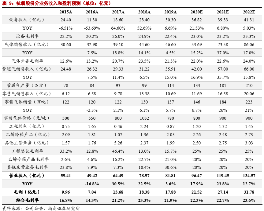 零售气体销售以管道气项目为基础,公司近年来强化销售激励、管理机制改善、新签气体合同赋予零售板块更大弹性,预计零售气体销售规模将再上一个台阶。考虑宏观经济企稳复苏趋势明显,下游对液态气体的需求景气度向上,我们预计公司零售气体2020-2022年的收入增速分别为7%、26%、21%。
