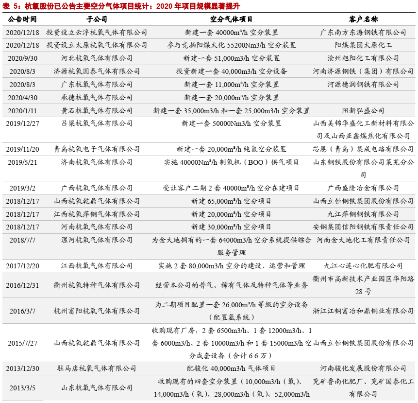 2019-2020年公司公告的空分气体项目规模处于历史较高水平,且手中仍有许多潜在气体项目有望落地。我们预计公司2021年投产的气体项目(包含已经公告和潜在气体项目储备)规模有望超45万方,2020年新签的气体项目有望接近30万方。