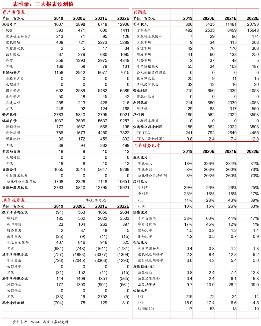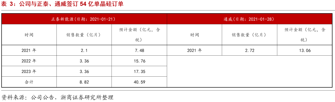 投资要点: 与通威签硅片订单,近期合计获订单达305亿元;2021年在手订单超15GW! 1)公司公告与通威签订“单晶硅片”销售合同。在2021年1月至12月,通威将向子公司弘元新材采购2.72亿片。按照PVInfoLink当前市场均价,预计总销售金额约13.06亿元(含税)。 2)从采购量级来看,2021年通威将向公司采购2.72亿片,对应均价约4.8元/片。我们预计对应硅片约2-2.5GW左右,其中绝大部分判断为210大尺寸硅片。 3)自2020年11月以来,公司与天合光能、东方日升、阿特斯、正泰先后签订292亿销售合同,叠加本次与通威签订的13亿长单,公司未来几年在手订单合计金额已达305亿元。 4)结合近期5大采购合同金额加总,现有几个订单对应2021年合计采购金额达到78亿元(含税)。我们测算对应硅片约15GW左右,公司2021年出货量有望较2020年大幅增长。 2020年业绩同比增长186-213%,低于我们之前预期;预计2021年业绩有望高增长 1)公司公布2020年业绩预告:受益于公司单晶硅业务的快速增长,预计2020年实现归母净利润5.3亿元–5.8亿元,同比增长186%-213%。业绩增速低于我们预期。我们预计公司股权激励、可转债、定向增发费用等影响业绩。我们判断公司单晶硅片盈利能力已接近行业龙头。 2)1月25日,隆基官网显示2月硅片报价与上月不变,硅片价格继续坚挺,表明硅片供应仍然紧张,好于市场预期。我们判断,随着公司产能的提升、规模效益的渐显、工艺的改善、大尺寸产品的出货,公司2021年业绩、盈利能力有望超市场预期。 市场担心硅片产能过剩、价格战、硅料保障问题,我们认为公司有望保持较高盈利能力 1)“产能过剩”?—预计未来2年小尺寸硅片结构性过剩,但210大硅片预计供不应求,公司产品以210大尺寸为主,生产效率更高,成本低于166/182硅片;且较小尺寸硅片具有溢价。 2)“价格战”?—降价为大趋势,公司已经历压力测试,均价下降20%,净利率仍处较高水平。考虑规模效应、成本降低、210出货比例提升、盈利能力提升,预计公司仍可保持较高净利率。 3)“拥硅为王”?—公司与大全、协鑫、通威、新特、天合等合作良好,未来硅料有保障。 盈利预测:投资建议:考虑战略地位和高成长性、对光伏行业的战略性贡献,目标市值600亿元 订单保障业绩高增长,我们维持公司2021-2022年盈利预测不变,预计2020-2022年净利润5.6/20/35亿元,增长203%/260%/73%;考虑近期30亿元增发摊薄,对应PE为72/24/14倍。公司迈向210大硅片龙头,全球单晶硅未来有望“三分天下”;预计公司将对光伏行业作战略性贡献。考虑高成长性,给予2021年30倍PE,6-12月目标市值600亿元。维持“买入”评级。 风险提示:疫情对全球光伏需求影响、全行业大幅扩产导致竞争格局恶化。 |