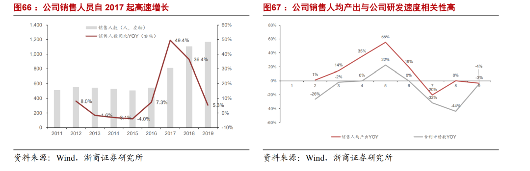 销售人均产出与公司研发速度相关性高。从人均产出来看,公司销售人员价值产出从2011年的150万元/年提升至2016年的433万元/年。随2017年销售团队高速扩容,人均产出趋于345万元附近。从专利申请数量来看,公司于上市2011-2016年专利申请与公布均在高位,2017年后开始逐年下滑,与人均收入呈现较强的相关性。因此我们认为公司是典型的技术驱动型公司,2019年公司在业绩大幅下滑的局势下,仍坚持高比重的研发投入,伴随2-3年的研发投入逐渐转化为产出,叠加公司销售团队层次深化,庞大的销售团队对应的人均产出有望再次提升,公司营收有望持续提升。