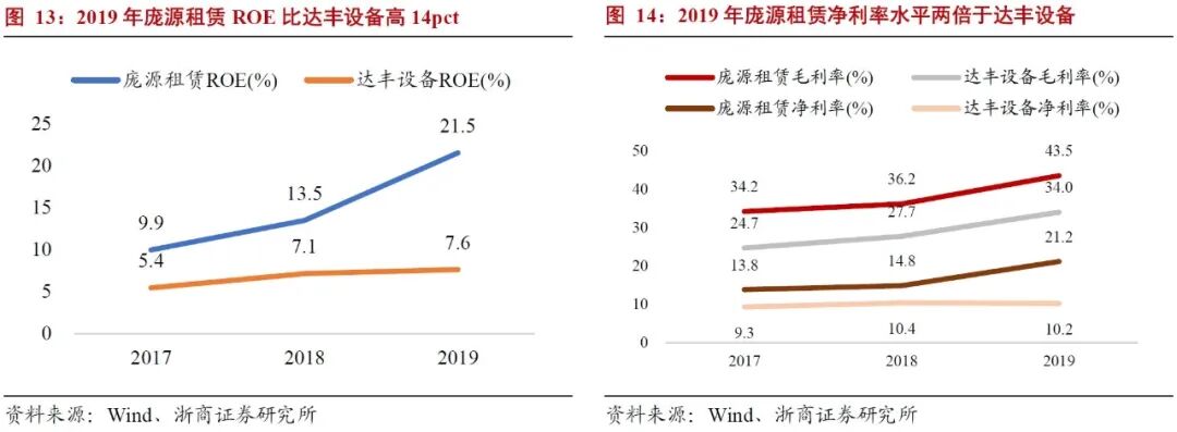 租赁设备品类有待扩张,对标联合租赁,成长空间较大。联合租赁为全球设备租赁龙头,目前市值200亿美元,约1300亿人民币,2020年联合租赁的营业收入为557亿人民币,净利润为58亿。2019年联合租赁的营业收入达652.3亿人民币,同期庞源租赁收入为29.2亿元,不足联合租赁的5%,成长空间巨大。