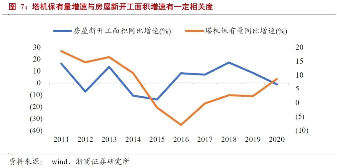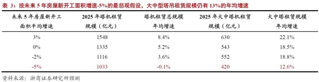 根据预测,2019年塔机租赁规模为1178亿元,2020年由于房屋新开工面积负增长(-1.2%),塔机租赁总规模降至1036亿元,其中大中塔租赁市场规模为232亿元;在较为保守(未来5年新开工面积增速为0)的情况下,到2025年塔机租赁总规模将达1335亿元,年均增长5%,其中大中塔租赁规模将达543亿元,年均增速为19%。