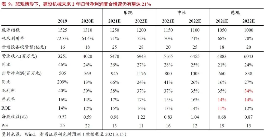 悲观情形:建设机械2021年、2022年分别实现收入49亿元、60亿元,同比增长21%、24%;实现归母净利润7亿元、8亿元,同比增长16%、27%。