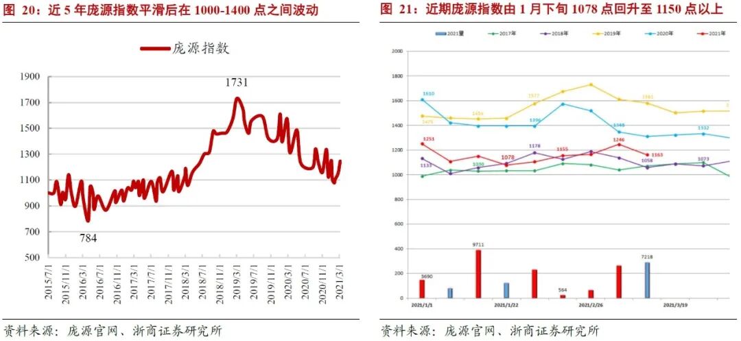 历史:2015-2020年庞源指数平滑后在1000-1400点之间波动。2015年7月庞源指数诞生之时设为1000点,到2016年4月下降到底部784点,随后缓慢上升到2018年四季度的1400点,2019年一季度快速上升到1731点,2020年庞源指数由1400点稳步下行至1200点。2016年低点是由于租赁商信心崩塌,廉价出租造成踩踏;2019年高点是因为18年底市场信心不足,租赁商投资意愿差,而地产向好,施工企业设备需求集中爆发,供小于求导致价格非理性急剧上升。将极端价格平滑后,庞源指数的价格合理回归区间在1000点-1400点。近期庞源指数由2021年1月下旬1078点回升至3月上旬1150点以上。