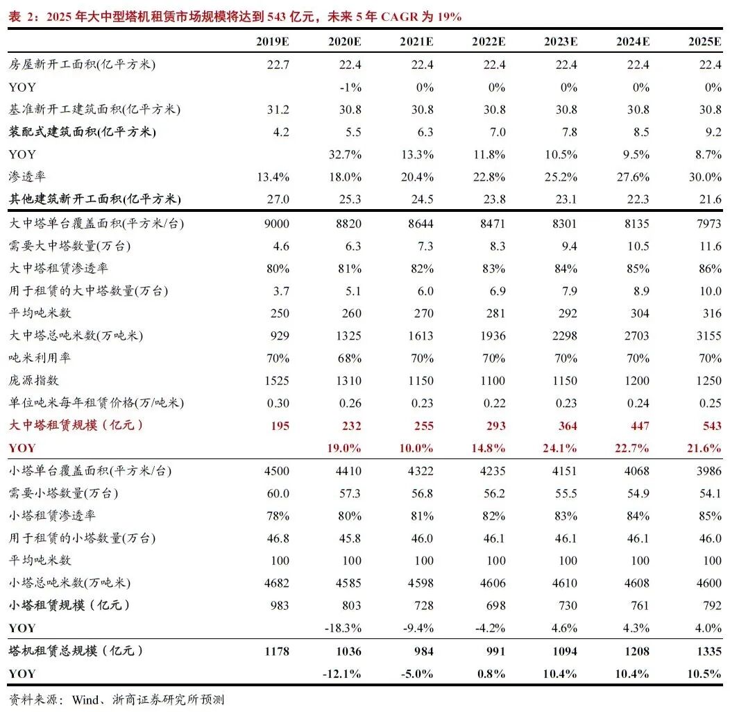 预测思路:将新建建筑拆为装配式建筑及其他建筑,分别对应大中塔及小塔租赁市场;以新开工建筑面积、单位面积所需吨米数、单位吨米年租赁价格测算出两类塔机租赁市场规模。