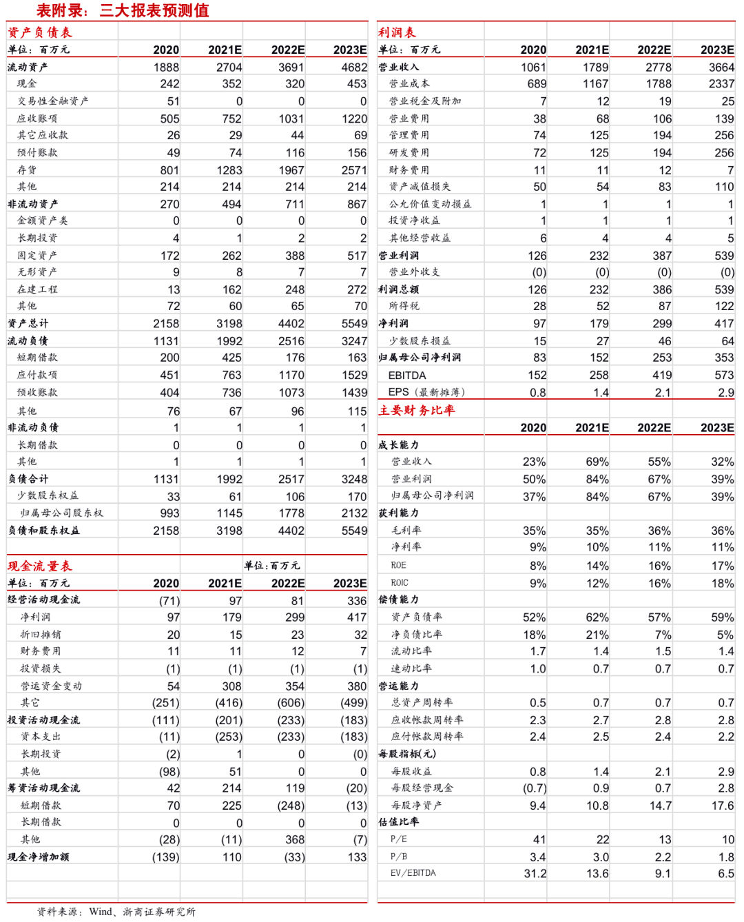 投资要点: 3.8亿定增获审核通过,用于研制光伏异质结(HJT)高效电池用PECVD设备项目 1)公司为光伏组件设备龙头,自2017年起开始着手进行PECVD项目的启动工作。本次定增预案于2020年5月发布,2020年12月发布定增修订稿,2021年4月6日定增申请获中国证监会发行审核委员会审核通过。 2)本次定增预计募集资金3.8亿元,将用于研制光伏异质结(HJT)高效电池用PECVD设备、形成设备年产能20台。在光伏异质结电池行业爆发来临之际,打开公司成长空间。 2020年报:营收同比+23%,净利润同比+37%;存货、合同负债同比增42%、28% 1)2020年度,公司实现收入10.6亿元,同比+23%;归母净利润0.83亿元,同比+37%。毛利率为35%(同比-3.1pct),净利率为9.2%(同比+1.1pct)。 2)分业务结构:光伏组件设备收入9.6亿元(同比+22%),毛利率34.4%(同比-5.3pct),核心产品包括层压机、串焊机等。光伏电池设备收入0.8亿元(同比+166%),毛利率41.4%(同比+14.4pct),盈利能力提升显著,主要产品包括电池自动化设备、电注入设备、PL测试仪、丝网印刷设备等。 3)受益下游大尺寸组件加速扩产,2020年末公司存货达8亿元,同比+42%,其中发出商品达4亿元。公司合同负债达4亿元,同比+28%,保障公司2021年业绩稳定增长。 4)期间费用率:2020年为18.4%,同比下降6pct。其中,销售费用率同比减少4.8pct,主要因执行新收入会计准则将运费等调整计入营业成本所致。管理费用率同比减少2.8pct,主要因样机试制材料费用下降所致。 公司光伏异质结设备、TOPCON设备进展顺利,期待2021年获突破 1)异质结设备:公司与德国H2GEMINI(核心成员曾就职于应用材料、梅耶博格、施密德等)合资设立金辰双子,技术实力+股权机制行业领先。同时,公司拟3.8亿定增加码PECVD设备产能20台/年。目前,公司PECVD设备样机正在制造和优化测试中,我们预计今年有望发往客户进行测试验证。 2)TOPCON:公司TOPCON用PECVD第一台样机已经完成测试,相关技术参数达到了设计要求,第二台量产样机已制作完成、正在测试中,有望受益传统PERC产线效率升级改造趋势。 盈利预测: 我们预计公司2021-2023年净利润为1.5/2.5/3.5亿元,同比增长84%/67%/39%,对应PE为22/13/10倍。考虑到公司光伏异质结设备的稀缺性,维持“买入”评级。 风险提示:光伏HJT设备推进速度不达预期;光伏需求不及预期;定增推进不及预期。 |