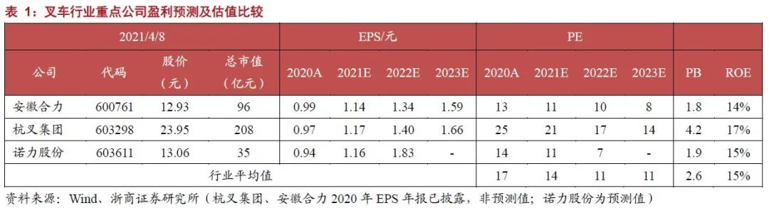 投资要点 营收销量创历史新高,国内市占率持续提升,利润规模实现行业第一 公司2020年全年实现叉车销售20.7万台,同比大幅增长49%;国内市占率提升2pct.至26%;营业收入、净利润及各项经营指标均创历史最佳水平。2020年公司加权ROE为18.2%,同比提升2.4pct.,过去四年稳步改善。2020年Q4销量持续高增长,实现营收33亿元,同比增长56%;归母净利润2亿元,同比增长26%。 加强费用管控取得成效,全年销售费率、管理费率下降,研发费率上升;销售费用中运输费3.43亿元,同比上升43%,主要系公司叉车销量增长且产能集中,终端运输成本较高所致;公司期末现金和应付账款余额均大幅增长,系销售回款和预付货款增加所致;全年所得税费用同比下降8.7%,系企业所得税减免优惠政策。 成本管控有效缓解原材料波动对毛利率影响,战略投资收益较为丰厚 2020年公司毛利率20.4%,同比略降1.0pct.;单季度盈利水平环比有所下行,Q4毛利率同比下降3.1pct.至19.6%,主要是受第四季度钢材大幅涨价影响,公司通过规模化降本增效缓解原材料价格波动带来的影响,成本管控效益显著。 2020年公司非经常损益0.5亿元,相较2019年减少0.5亿元;中策橡胶投资收益划归经常性收益。公司间接持有中策橡胶集团有限公司11.4%股权,获得较为丰厚的战略投资收益;2020年投资现金流净额为6.5亿元,过去五年首度由负转正;经营性现金流净额为9.1亿元,同比基本持平。 发行可转债推进新能源叉车扩产,提升民营叉车龙头市场竞争力 公司于今年3月25日正式启动11.5亿元可转债申购,债券期限为6 年,拟投资建设年产6 万台新能源叉车项目、研发中心升级、集团信息化升级、营销网络及叉车体验中心,建设期2年;其中年产6 万台新能源叉车项目预计年均新增税后利润约3亿元。募投项目建成后将有效扩张产能,提升技术水平及经营效率。 盈利预测与估值 公司业绩高增长。2021年叉车行业景气度有望持续,公司市占率及核心竞争力有望进一步提升,预计公司2021-2023年分别可实现净利润10.1/12.1/14.4亿元,同比增长20%/20%/19%,对应EPS为1.17/1.40/1.66元,对应当前PE为21/17/14倍,维持 “买入”评级。 风险提示 制造业投资低于预期;原材料价格大幅波动;行业竞争格局恶化 |