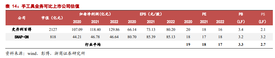 手工具业务:业绩较为稳定,参考海外同业估值,给予20-30X的估值。