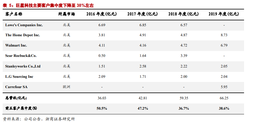 原有客户加速电商发展,公司有望深度受益。根据测算,2019年公司在下游客户家得宝、沃尔玛中的电商收入占比公司总电商收入超30%,叠加疫情以及公司品牌力不断提升,电商渠道有望为公司打开新增量窗口。