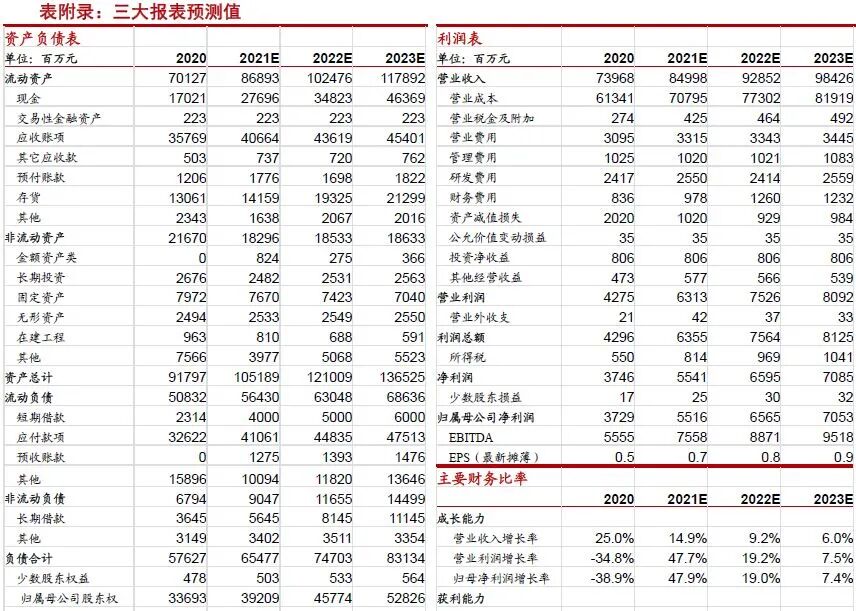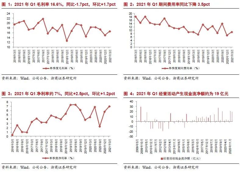 核心观点: 一季报业绩接近预告上限,同比增长182%;盈利能力大幅提升 2021年一季度实现收入250亿元,同比增长80%;净利润17.3亿元,同比增长182%,接近业绩预告上限。 一季度净利率大幅提升,费用管控改善,期待“新徐工”盈利能力改善 2021年Q1净利率约7%,同比提升2.5pct,环比提升1.2pct;毛利率16.6%,同比下降1.7pct,环比提升1.7pct。一季度净利率改善主要因为费用管控改善导致的期间费用率下降,同比下降3.5pct。 起重机、桩工机械和高空作业机械增长亮眼,桩工机械毛利率提升2pct 2020年起重机实现收入265亿元,同比增长27%,毛利率23.4%,同比下降0.4pct;桩工机械实现收入73亿元,同比增长24%,毛利率21.5%,同比提升2pct;高空作业机械实现收入37亿元,同比增长55%,市占率提升4.8pct。 “新徐工”:吸收合并控股股东徐工有限,工程机械板块整体上市 4月21日公司公告将发行股份吸收合并控股股东徐工有限;徐工有限旗下的挖掘机、混凝土机械、塔机和矿机等资产将注入上市公司(“新徐工”)。徐工有限2020年9月完成混改,由国有独资转变为国资控股、民企和员工共同参股的混合所有制公司。其中:员工持股平台增资8.7亿元,参与对象为高管团队和核心骨干,合计435人 预计2021年“新徐工”备考收入超过1200亿,备考净利润约为95亿 预计2021年“新徐工”备考收入超过1200亿元,成为收入规模最大工程机械公司;预计2021年挖机净利润接近30亿,混凝土+塔机+矿机净利润10亿左右,上市公司净利润约为55亿,资产注入后“新徐工”备考净利润约95亿。随着改制后活力释放、管理改善、产品结构优化,盈利能力提升空间和潜力大。 工程机械为中国当下优势产业,中国龙头完成进口替代有望迈向全球龙头 工程机械为中国当下优势产业,中国公司能依赖规模经济、产业链优势、运营效率优势取得全球龙头地位。中国工程机械行业龙头将在完成国内的进口替代后在全球取得相当的市场份额,从中国龙头走向全球龙头。 投资建议: 暂不考虑徐工有限工程机械资产整体上市,预计2021-2023年归母净利润为55/66/71亿元,同比增长48%/19%/7%,PE为10/9/8倍。维持“买入”评级。 风险提示:资产注入进度低于预期;基建、房地产投资增速不及预期; |