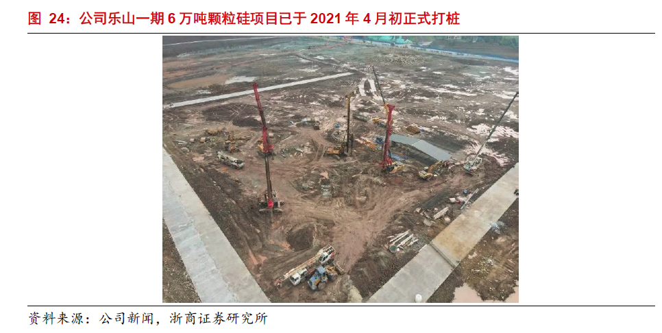5) 2021年4月27日,公司乐山颗粒硅(一期)项目首套核心装置(硅烷气主装置)187根桩基已经于全部结束,正在进行第二套核心装置187根桩基,目前已经完成116根。5月22日将进行首套装置土建施工,预计一期首套装置(6万吨颗粒硅)调试时间节点将在在2022年2月28日。