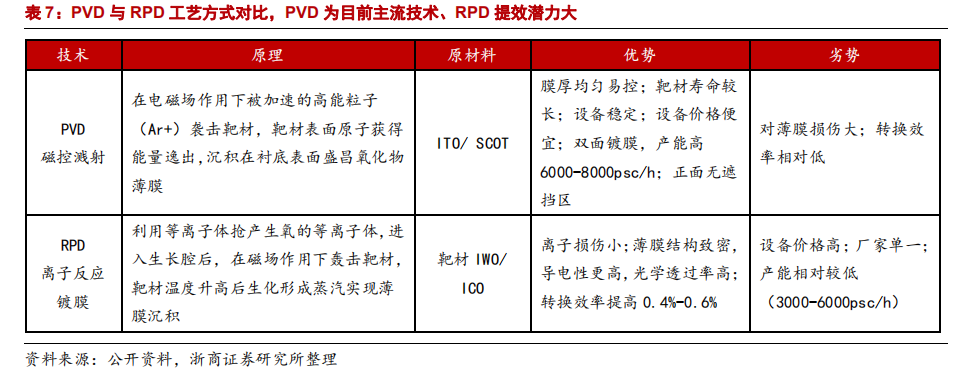 3)TCO薄膜设备-PVD/RPD:技术壁垒低于PECVD,主要包括RPD和PVD两种的技术路径设备。目前主流技术路线是用PVD(物理气相沉淀),相较于PVD,RPD的效率和质量更高,但是受制于日本住友公司对设备和靶材的垄断,成本较高。