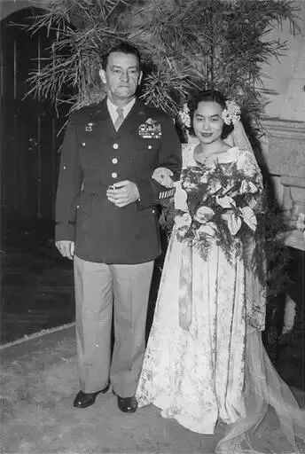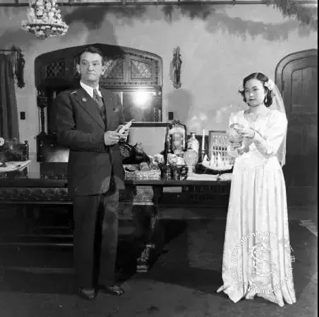 结婚时,陈香梅身穿上海“绿屋夫人”所制婚纱,陈纳德则着军装