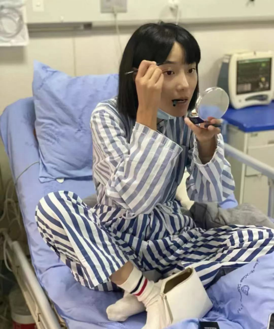 她的32岁生日是在病床上过的,虽然身体不适,但还是认真给自己画了眉毛。