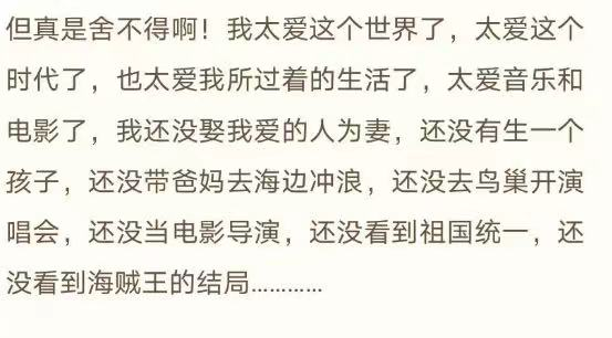 “真是舍不得啊,我太爱这个世界了。 “我还没有娶我爱的人为妻,还没有生一个孩子,还没带爸妈去海边冲浪,还没去鸟巢开演唱会,还没当电影导演,还没看到《海贼王》的结局……”