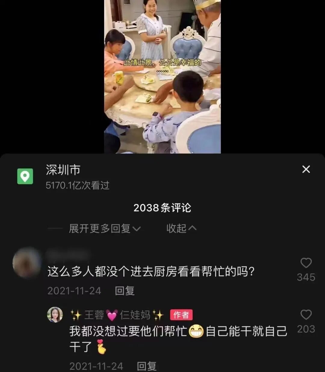 去年夏天的第一条视频,王蓉一顿饭还只有萝卜炖大骨、鸡蛋肉沫炒秋葵、蒜蓉炒生菜,3个较为常见的菜。像其他全职主妇一样,她利用煮饭炖汤的空档,洗衣晾晒打扫。王蓉去医院拔个牙回来,家里就变样了,衣服被子堆成山,玩具乱扔一地,桌上碗筷狼藉。出门前,她拜托老孙照看孩子们,结果老孙接了个工作电话就火急火燎出去了。买菜回来距开饭只有两小时,一大家子闲聊坐等,王蓉一个人在厨房忙活出12道菜,等最后一道菜端出来,两个盘子已经见底了。很多网友批评老孙懒,王蓉吐槽:“你永远叫不醒一个装睡的人。”有埋怨没问题,晒幸福也没问题,问题就在于前后反差太大,转弯太急。“早餐吵架”事件之后,她一扫之前的沉闷,画风明显富足、明亮起来。陷入争议的王蓉出面辟谣,说不是豪宅,只是140平方米的学区房,房产证上是她的名字。“自己也没说过每月零花钱50万,家庭财产是隐私,不知道怎么传开的。”