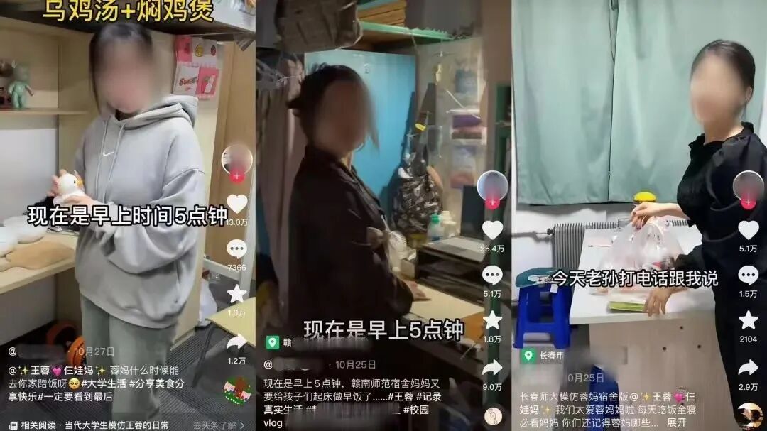 有靓汤,有点心,有素有荤,甚至还有蒜蓉粉丝鲍鱼这样的硬菜。有网友说,她家每月伙食费1.8万,一顿早餐看着像宴席。王蓉把饭菜一趟一趟端上桌,再柔声喊3个孩子起床。有的打着哈欠,有的蹦蹦跳跳,围坐桌边吃早餐。同住的爷爷胃口最好,一句话不说,闷头吃饭,吃完就去送孩子们上学。一家之主老孙起床最晚,王蓉不急不躁,温柔呼唤,为他端上早餐。连早餐都如此繁复,晚饭、周末就更不用说了。围观的网友表示既羡慕又嫉妒,评论区“妈”声一片,200斤的宝宝们还留言点菜。王蓉真正出圈,是因为上海某高校表演系的一个女生在宿舍模仿她做饭。鸡鸭鱼肉用玩偶代替,口头禅、表情神态拿捏到位,一时引发众多女生模仿。还有网友集体喊话:“老孙太幸福了,全网女生都在给你做饭!”二创带火了原创,人们追着去看原视频,1987年出生的三胎妈妈王蓉,被追捧为“家庭主妇天花板”。有人吐槽:“要是让我每天5点爬起来做饭,我肯定会埋怨。”那天她睡过头了,为了不耽误孩子们上课,就快速做了个“简单”早餐:蒸了红薯和玉米,打了五谷豆浆,熬了红糖鸡蛋水,煎了几个虾饼。结果老孙起床后,说红薯玉米他不爱吃,抱怨王蓉没给他炖汤,两人吵了起来。老孙出门上班,孩子们上课了,王蓉孤零零坐在桌边,一边把剩下的东西吃掉一边抹眼泪。王蓉后来解释说老公很爱她,那次算不上“骂哭”,他只是不赞成她一边干活一边拍视频,没有把时间统筹好。后来,有网友在评论区说老孙是宠妻狂魔,每个月光是给王蓉的零花钱就高达50万元。
