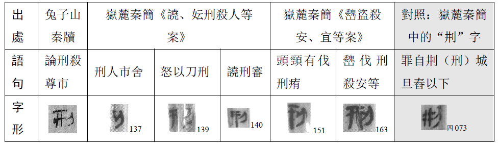 下面表列的 “刑”,除《譊、妘刑杀人等案》简137一字残缺较多尚难断言外,显然都从“幵”,有别于秦汉简帛中常见的“㓝”字。[28]
