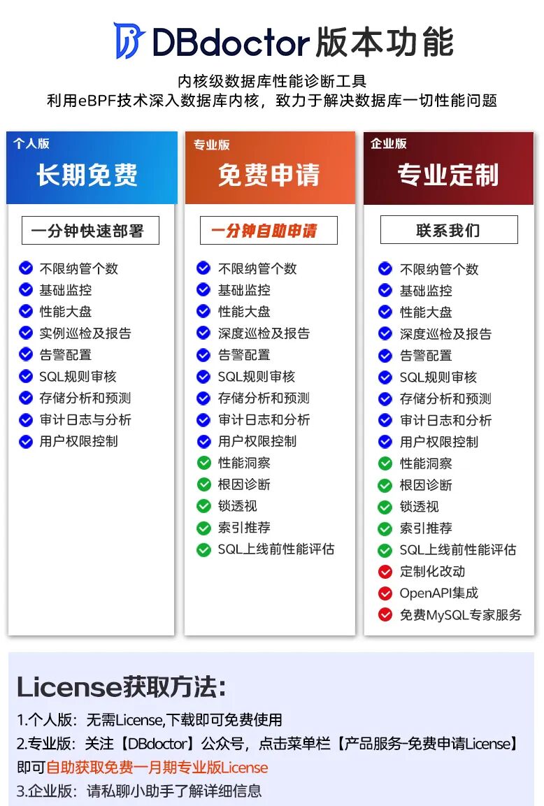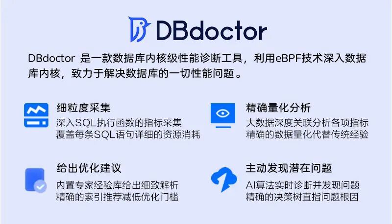 DBdoctor是聚好看科技股份有限公司自主研发的一款数据库内核级性能诊断工具,首次将eBPF技术聚焦在了数据库领域,一分钟内定位数据库性能问题并给出优化建议,实现数据库性能诊断百倍提效。