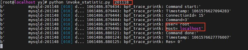 pid即为需要探测的mysqld的进程号,指定pid执行python invoke_static.py即可开启探测,当该mysqld有SQL执行时,该探针将触发并得到日志打印。如下示例: