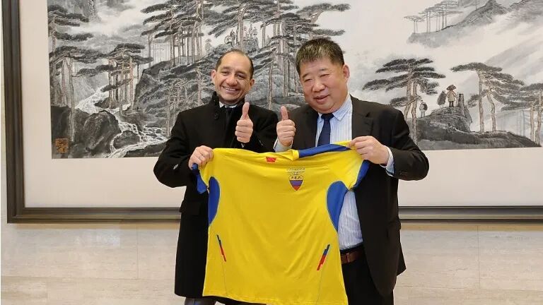 会谈结束后,卡洛斯·拉雷亚大使向王立朝主任赠送第十五届中拉企业家高峰会纪念品及厄瓜多尔国旗和国家队球衣等礼物,王立朝主任向卡洛斯·拉雷亚大使回赠中国瓷器。