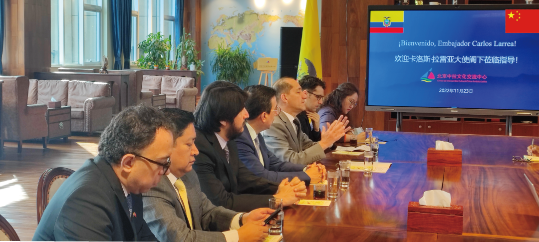 11月23日,在第十五届中拉企业家高峰会即将于厄瓜多尔第一大城市瓜亚基尔召开之际,厄瓜多尔驻华大使卡洛斯·拉雷亚(Carlos Larrea)携公使克里斯蒂安·曼切诺(Cristian Mancheno)、商务参赞安德烈斯·阿马斯(Andrés Armas)等一行七人莅临北京中拉文化交流中心同王立朝主任就赴厄参会并同厄各机构交流合作进行磋商。