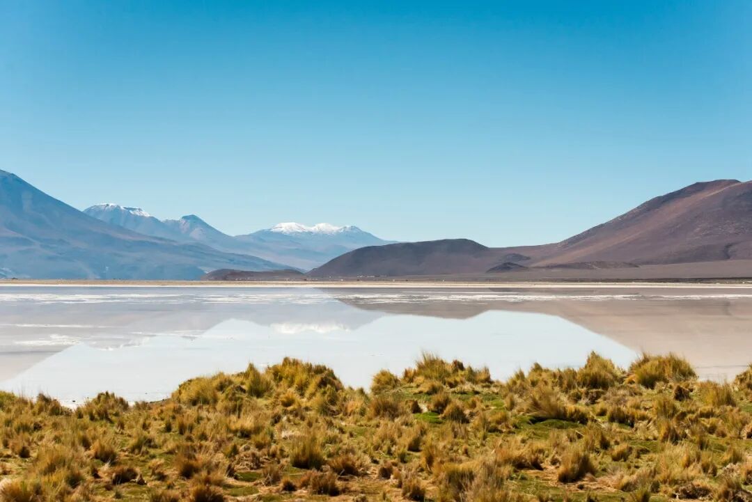 黄褐色、白色和蓝色,这三种色彩几乎霸占了整个阿塔卡马沙漠。晶莹剔透的蓝色咸水湖和形状奇诡的岩石峡谷交融着,映衬着远山有一种如梦似幻的氛围。这片荒凉的不毛之地,被称为地球上最接近火星的自然环境。
