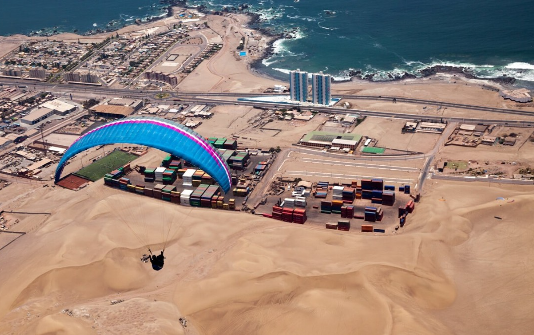 在智利北部的城市如伊基克 Iquique 和阿里卡 Arica,你可以背上滑翔伞从空中俯瞰沙漠与海洋相连的奇景,直观地感受干燥与湿润是如何和谐共存的。