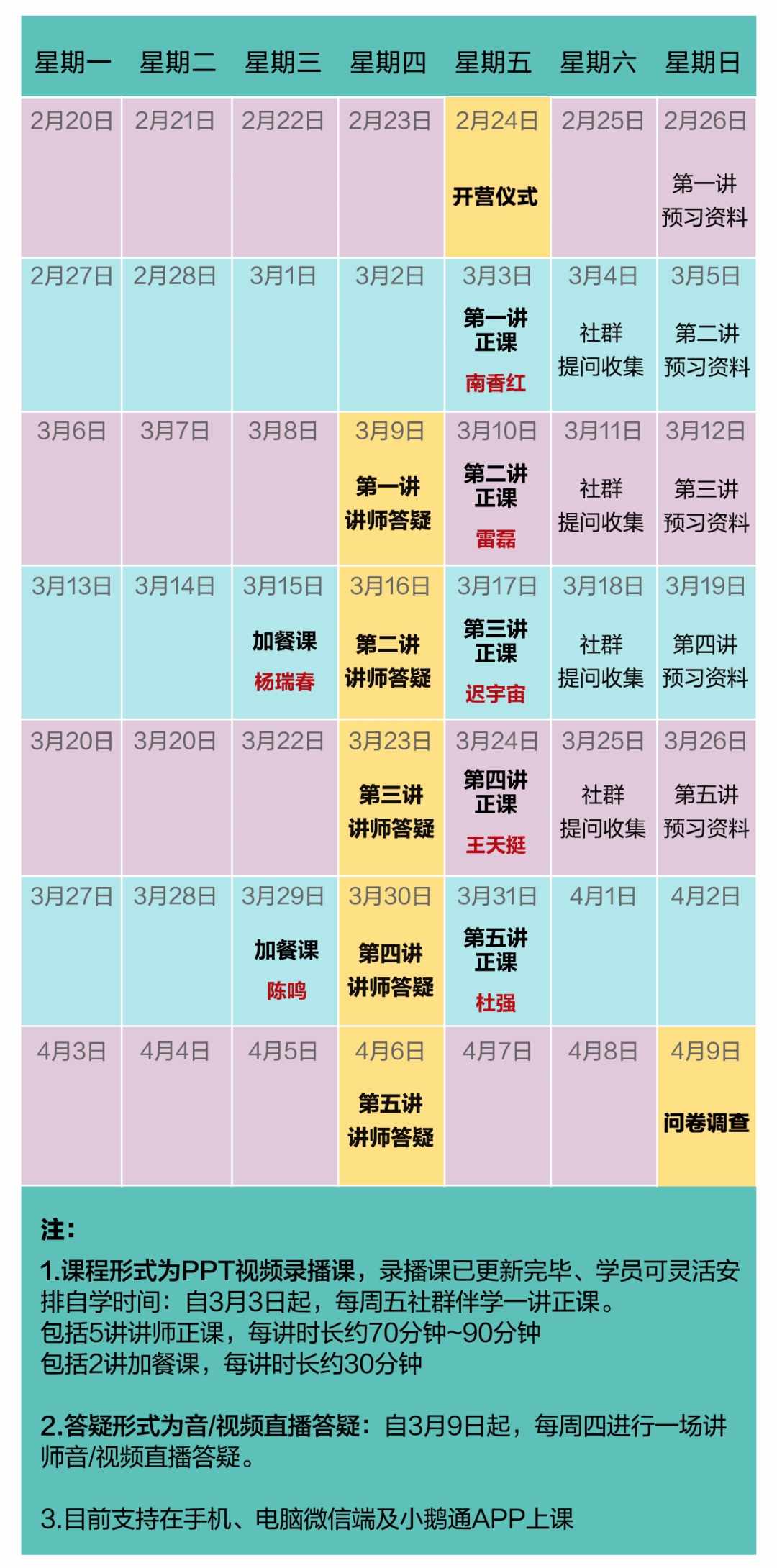 (温馨提示:迟宇宙老师答疑为音频录播,其余4位导师为视频直播。)