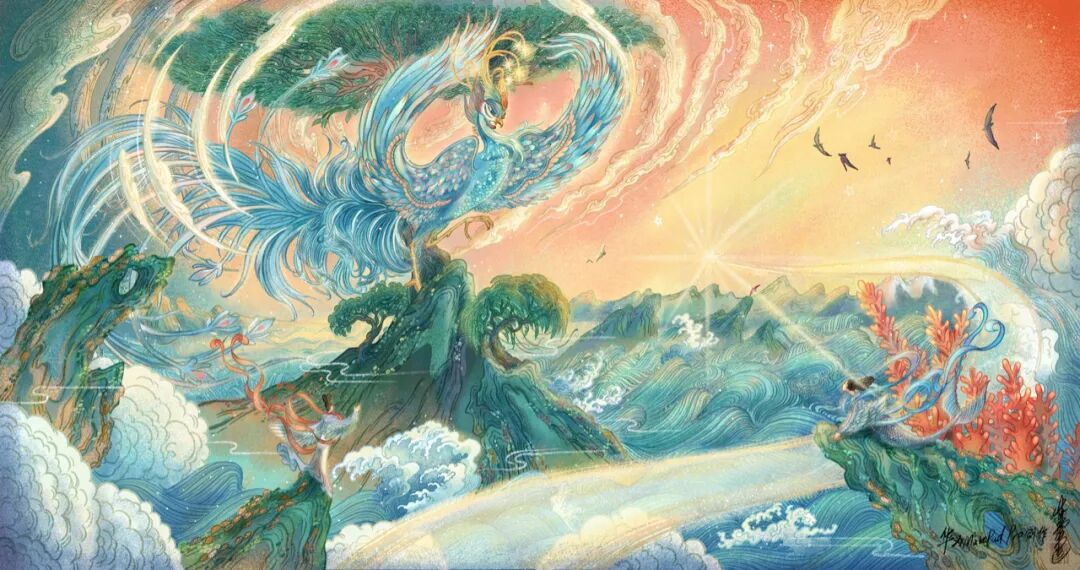 华为平板“天生会画”项目还邀请了另外两位插画家:为《大圣归来》和《哪吒之魔童降世》创作官方海报的画师张浩,和第13届中国动漫金龙奖最佳插画奖金奖获得者叶露盈。他们分别选取了《山海经》中的上古神兽驺吾和鸾鸟,从武则天金简、汝窑天蓝鹅颈瓶中选取黄和青作为画面基色。