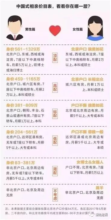 之前有一条微博特别特别的火,是《凤凰周刊》调查了北京附近很多相亲角从而得出的一个结论,说相亲其实有一个价目单,每个人都是一场明码标价的买卖。 对男性来讲,它提出了需要用房产、收入、学历、户口,这四个指标来进行评判;对女性来讲,它里面有相貌、收入、学历、房产、户口和属相这六个指标。不管在哪,相亲的第一个指标是房产。在相亲的市场里,房产是首先会被议论到的话题。有调查数据显示,在房产这个话题上,男性基本上是一个必填项,对女性而言则是个加分项。在西安革命公园的相亲角,年过六旬毛先生告诉记者,他已经记不得自己来到这个相亲角多少次了,从前年开始只要一有时间就来,女儿是82年的大姑娘,因为工作太忙一直未婚,而且自身要求的条件也很高,希望能找到一位与她兴趣爱好等一致的男士作为伴侣,可是拖了一年又一年依然单身。