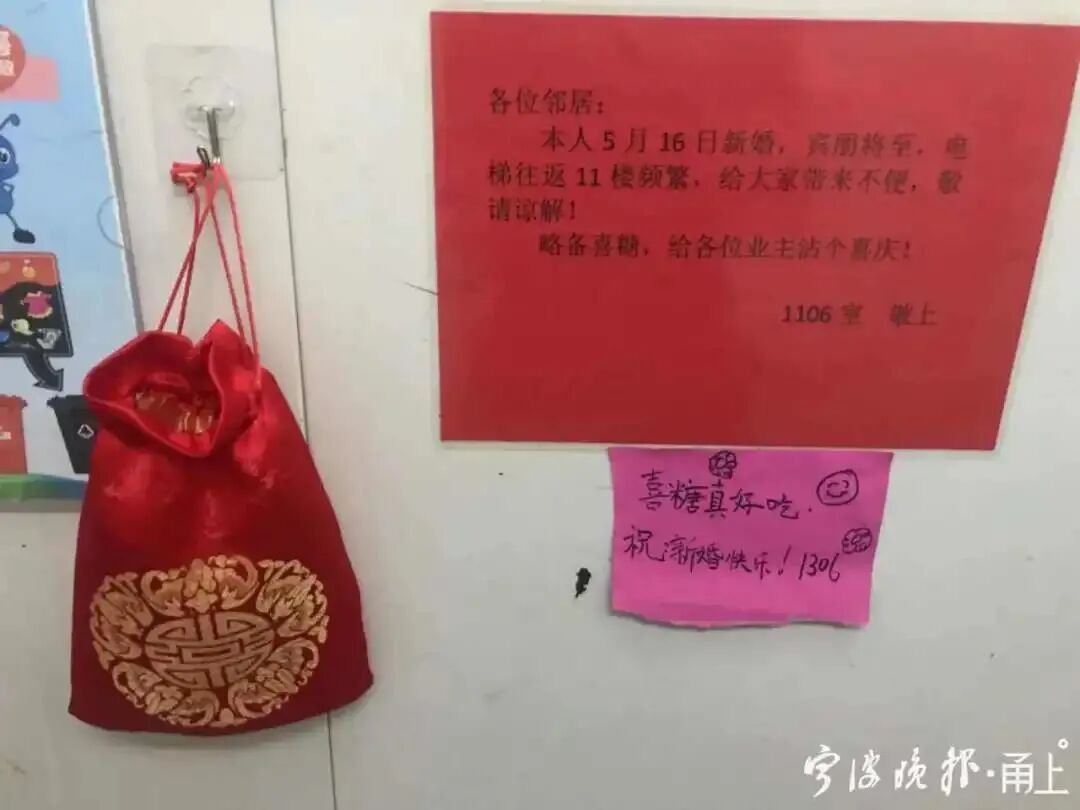 近日,浙江宁波一小区电梯里的小“惊喜”,让住户们回味了好几天。一对新人担心结婚当天频繁使用电梯给其他住户带来困扰,于是想出了一个办法,在电梯里准备了“小惊喜”,只是没想到邻居们的回应更暖心。详情