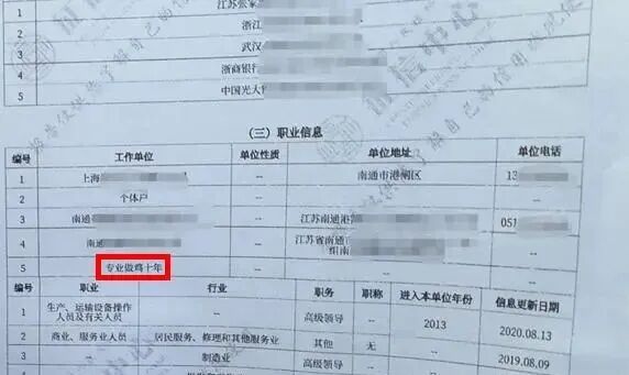房女士征信报告职业信息里赫然写着“专业做鸡十年”字样