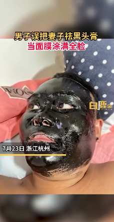 7月23日,浙江杭州的隆女士洗澡出来时发现,老公误把自己的祛黑头膏当面膜涂脸,涂的满脸黑,看着好气又好笑。