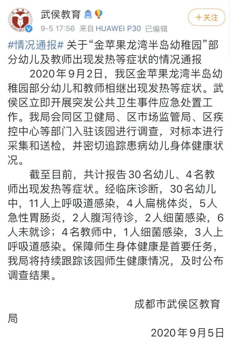 9月2日,四川省成都市武侯区金苹果龙湾半岛幼稚园30名幼儿和4名教师相继出现发热等症状,多名幼儿送医后诊断出急性胃肠炎、上呼吸道感染等,此前有家长怀疑与幼儿园饮食有关。截至发稿,成都市武侯区教育局称相关部门正在持续跟踪调查,将及时公布调查结果。